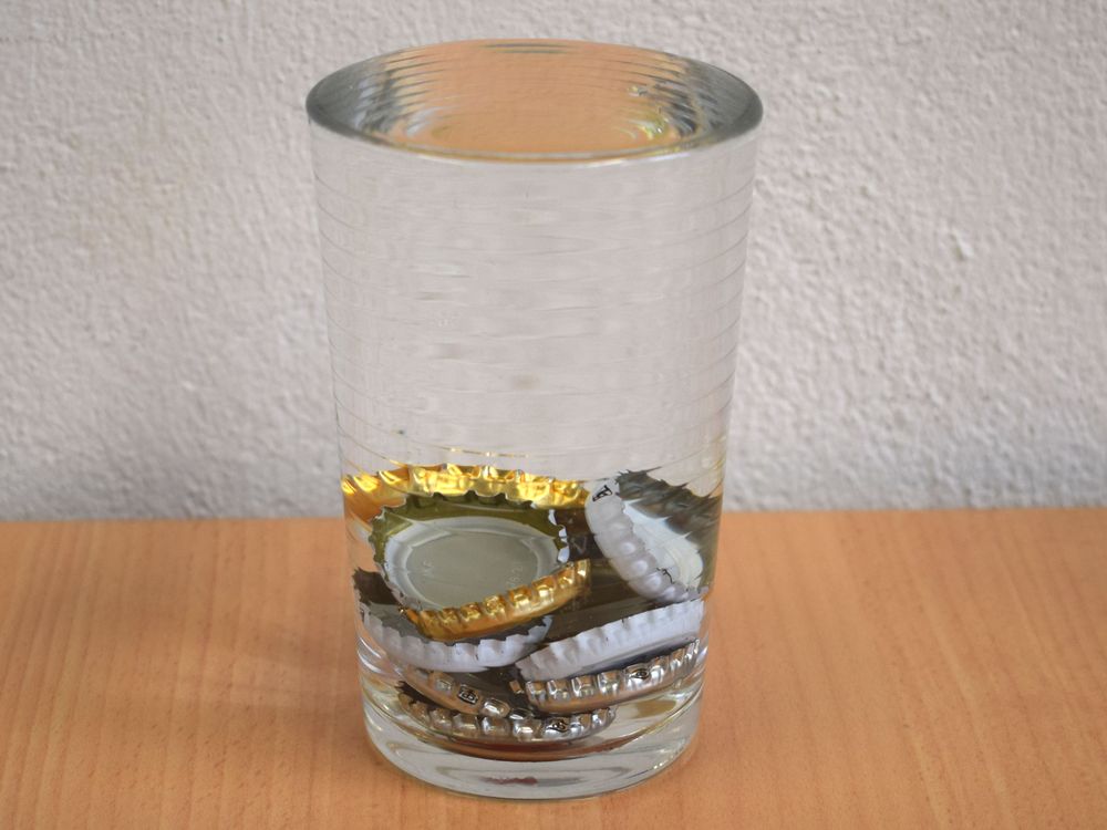 - Schätzen, wie viele Kronenkorken in das mit Wasser gefüllte Glas passen, ohne dass ein Tropfen überläuft.