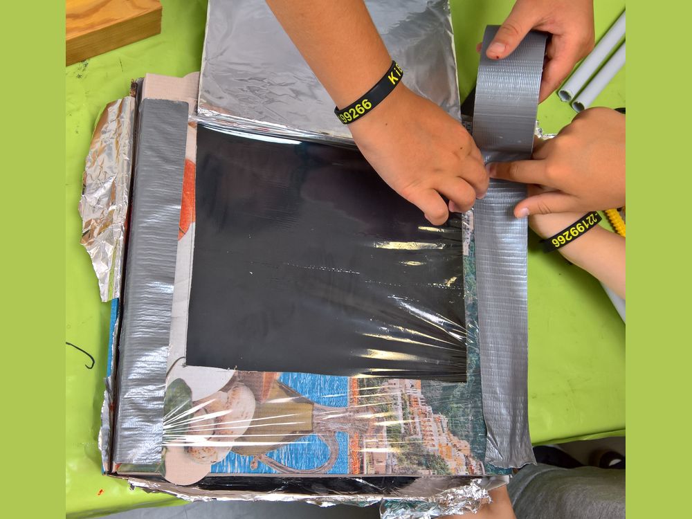 Die in Alufolie eingewickelte Schachtelklappe erfüllt die Rolle eines Spiegels. Mit dem Spiegel lassen sich Sonnenstrahlen lenken. In unserem Ofen lenken wir die Sonnenstrahlen nach innen, auf dein Essen. Die eingebaute Schicht aus Frischhaltefolie lässt die Wärme nicht entkommen. Das Essen wird dann immer wärmer.